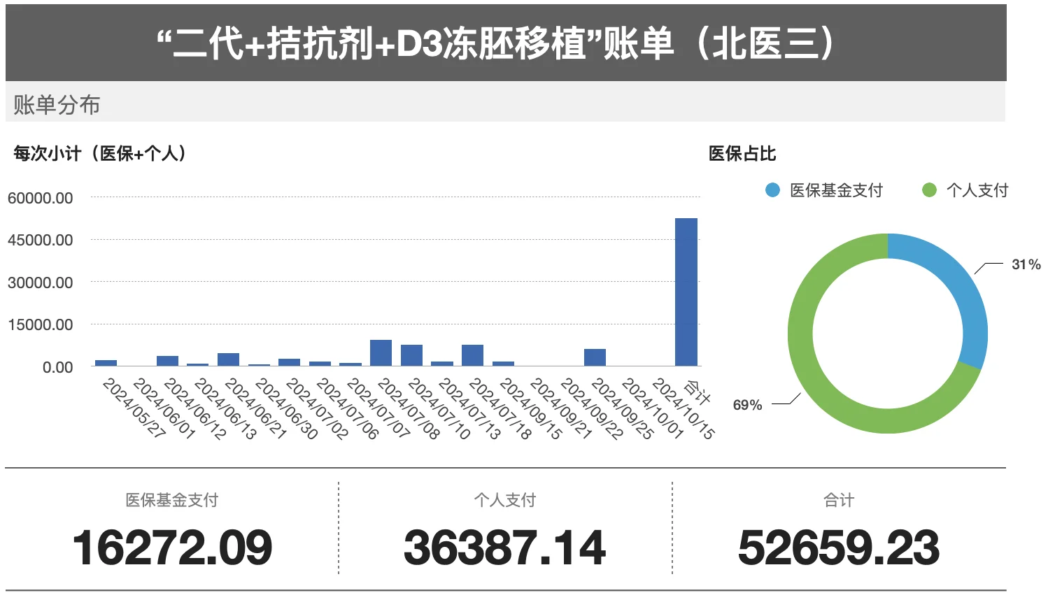 半年时间,三次促排+四次取卵+两次移植,分别尝试了:拮抗剂、微刺激、改良自然周期、纯自然周期四种。两次取到可用卵:拮抗剂获得俩D3,改良自然获得一个D3两次移植都失败,一次冻胚人工周期,一次D3鲜胚哎,妥妥练成了试管老司机这半年一共折腾进去¥61311.41(个人支付),每次医保和个人支付大概四六开......